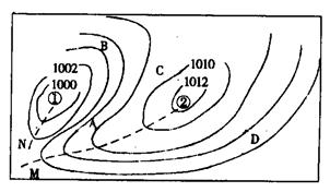 (3)天气系统①过境时,常出现的天气是 ,M、N两条线中,可能形成锋面的是 。(2分)