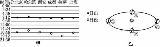 1.比较图甲中六个城市白昼的长短,其中昼长时间最长和最短的两个城市是2.此日地球所处的位置,可能是在图乙中的