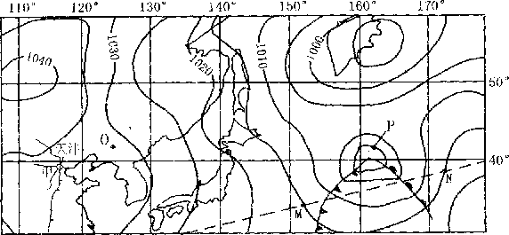 (3)如果图中等压线状况维持不变,某海轮从M点向N点航行,天气将如何发生变化? (从降雨、气温、风向等三方面简要分析)(6分)