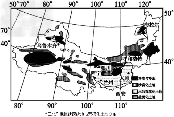 (2)原因:①自然条件恶劣,干旱,风大,沙多,植被稀疏;②人口增加,过度开垦、过度放牧、过度樵采。治理措施:①控制人口增长,提高人口素质;②调整产业结构,发展节水农业;③合理放牧,防止过度开垦,保护好周围生态环境;④加大荒漠化防治的投入,加强管理,加强执法力度。