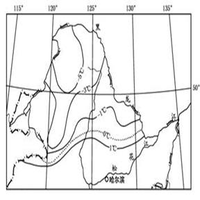 (2)该地邻近强大的冬季风源地(蒙古 ——西伯利亚高压),冬季受其影响大,气温比同纬度地区低很多(2分);夏季气温与同纬度相比差别不大(2分),因此导致平均气温偏低,0℃等温线纬度位置偏低。