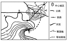 小题2:A地等深线比较稀疏,沿海坡度平缓,适宜建设海滨浴场;B地等深线稀疏,海水较浅,不利于建设港口;C地虽位于盛行风向垂直的郊外,但位于城区河流的上游,容易产生水污染,不适合建化工区;D地等深线密集,海水比较深,适宜港口建设。