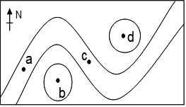 点评:本组题一定要求考生掌握两条等值线之间的闭合曲线,遵循“大于大的,小于小”的原则,利用这一原则对等高线地图进行判读,试题具有一定的理解上的难度,对于高二的考生来说属于中档偏难的的题目