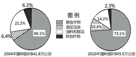 4、单选题 该图表示2004年、2010年安徽省农作物播种面积结构。完成问题。