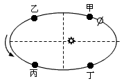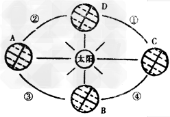 (1)在图中A画出晨昏线及地球自转的方向,并用阴影标出其夜半球的范围;在①③段画出地球的公转方向。