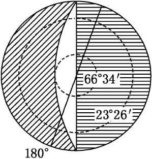 2、单选题 下图是以极点为中心的投影图,斜线部分表示黑夜,横线部分表示东半球,数字表示经纬度。读后完成(1)~(2)题。
