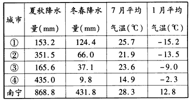 1、单选题 下表为我国五个自治区行政中心城市气候资料表。读表格数据,回答1—2题。