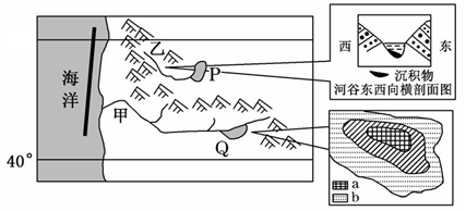 3、综合题  下图为“世界某区域简图”,图中右侧分别为“乙河流局部河谷剖面示意图”和“Q湖不同季节蓄水面积分布图”。读图回答问题。