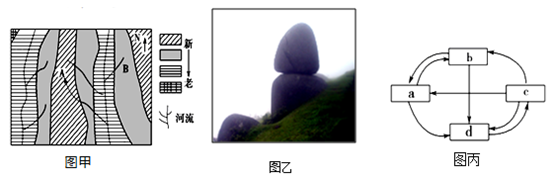 4、单选题 读某区域“岩层新老关系示意图(图甲)”、 “地貌景观照片(图乙)”和 “岩石圈物质循环图(图丙)”,回答下列各题。