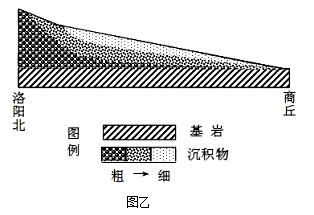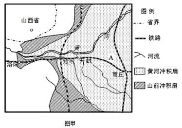 5、综合题 (20分)2010年10月,电子产业专业制造商富士康最大的组装生产企业在郑州落户。图甲为黄河冲积扇分布图(局部),图乙为图甲中洛阳北至商丘一线冲积扇剖面示意图。完成下列问题。