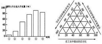 4、单选题  读某城市“城市人口占总人口比重变化图”和“劳动力在各行业中的百分比图”,回答21~22题。