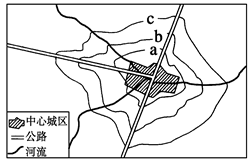 小题2:从图中可以看出,地租分布等值线沿着公路线由中心向外凸出。可见,影响等值线凸起的因素是交通的便捷程度。