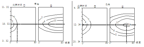 4、单选题 甲(49°46?N)、乙(32°N)两山地在冬至日不同时刻,北坡和南坡不同坡度所接受到的太阳直接辐射量〔0.1卡/(平方厘米·分)〕的变化图。回答问题。
