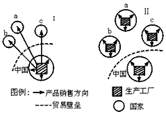 2、单选题 ? 下图表示我国某工业公司向异国发展的过程。a、b、c三国均为发达国家。第Ⅰ阶段,该公司将国内生产的产品销往a、b、c三国;第Ⅱ阶段,该公司分别在a、b、c三国投资设厂,以避开贸易壁垒。据此回答1—4题。