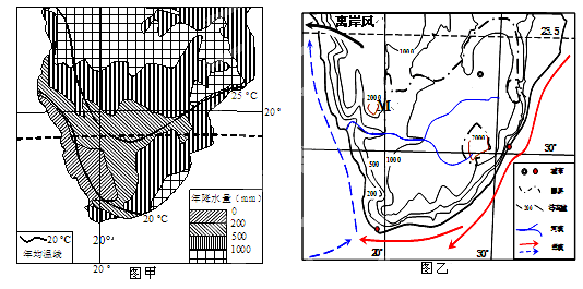 (1)图示是非洲南部图。由图可以看出:等温线在陆地向南凸,主要是海洋的热容量更大,海陆热力性质的差异造成的;同纬度大陆东岸温度较西岸偏高,主要是东部沿岸是莫桑比克暖流流经,增温增湿,西部沿岸是本格拉寒流流经,减温减湿。