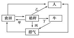 小题1:甲方式直接把秸秆作为肥料还田,没有发挥其能源与饲料方面的价值;乙方式直接把秸秆作为燃烧,利用方式最简单,效益低下;丙方式没有发挥秸秆在饲料方面的价值。只有丁方式充分发挥了秸秆作为饲料、肥料、燃烧等多方面的利用价值,故效益最好。