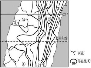 小题1:陆地上等温线闭合,越向中心气温越低,多考虑为山地地形的影响。提取图像信息,等温线主要为东北-西南走向,结合定位,知此处为台湾山脉,故选C。
