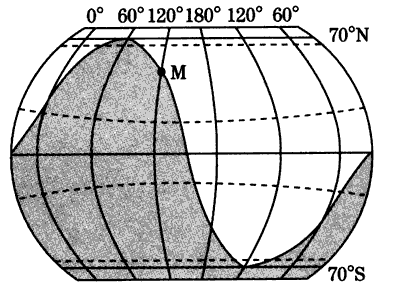 2、综合题 下图是“全球昼夜分布图”(阴影部分为夜,M点为7月6 日),读图回答下列问题。