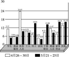 从发病职业构成来看,4月26日—4月30日发病率最高的是医护人员,这与医护人员与SARS病人密切接触,并对该病情缺乏足够的了解,防护措施不利有关。5月21—5月25日?发病率较高的是待业、其他、民工等,这些人员一般文化层次较低,防护意识不够是可能的原因。