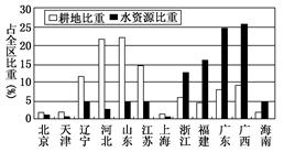 2、单选题 读中国东部沿海12个省(市、区)耕地、水资源比重对比图,完成下列问题。
