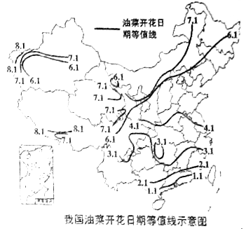 小题1:油菜开花日期等值线大致呈纬向分布(或油菜花由南向北依次开放)(1分);我国东南部气温从低纬向高位递减(或太阳直射点位置由南向北推进,气温也随之由南向北逐渐上升)(1分)。