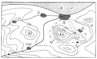 小题3:为了将⑤地的铁矿运到③镇附近加工出口,图中M、N、P、Q四条公路线设计合理的是