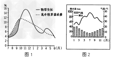 2、单选题 下图1为某地牧草生长与乳牛草料需求关系图,图2为该地气候资料。读图完成1~2题。