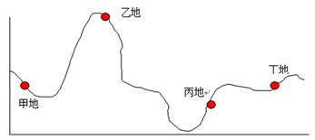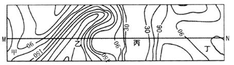 小题1:图中分析的,等高距为30米,MN一线最低处0—30米,最高处270—300,高差在240—300米,故排除A;根据陡崖公式,,判断高差为60—120米之间,排除B;根据鞍部的特征(相邻山顶之间呈鞍部形),图中没有经过鞍部,排除D;图中分析得,丙地两侧海拔高,中间低,为谷地,故选C。