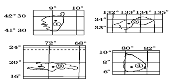 3、单选题 读“四岛的经纬网图”,回答问题。