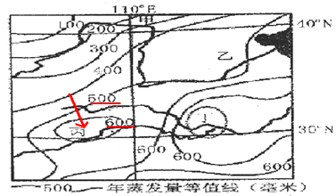A.丙地年蒸发量小于500毫米