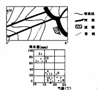 3、单选题 读“某地的等高线示意图”(图中虚线表示此日的昏线)和“该地区的气候资料”图后,回答下题