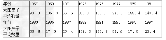 1、综合题 下面是1967~1997年太阳黑子的平均数量表,读表回答下列各题。