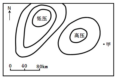 2、单选题 下图示意长江中下游地区夏初某时的气压系统,该气压系统以每天120千米的速度自西向东移动,据此完成问题。