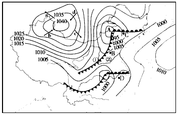 (3)B;冷锋;大风降温、云层增厚、雨(雪);气压升高,气温降低,天气转晴