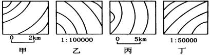 1.等高距一致,故水平实际距离越短,则坡度越陡,而比例尺越大,表示的实际距离越小,故坡度最陡的是比例尺最大的丁图。