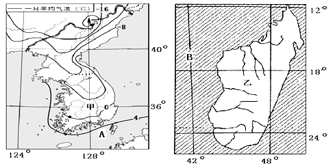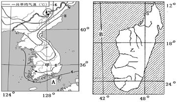 (1)据图分析,一月甲国所在半岛北部m地和南部n地的温差为多少度。(2分)