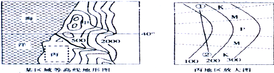 3、单选题 左图为某区域等高线地形图,图中丙地区终年受西风控制。右图为丙地区放大图,图中的实线为等高线(单位:米),虚线为地层界线,地层P到K由老到新。读图,回答下列各题。