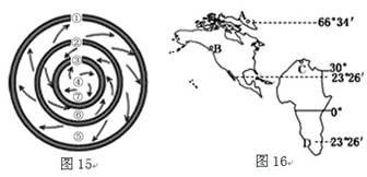 (1)图15表示的是________(南或北)半球的气压带、风带分布状况。(2分)