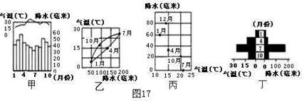 【小题3】图示C位于地中海沿岸,为地中海气候;而根据图17的气温、降水量信息判断,甲终年高温多雨,为热带雨林气候;乙地最低月温在0°C以上,雨热同期,为亚热带季风气候;丙地雨热不同期,判断为地中海气候;丁地最低月温在0°C以下,雨热同期,判断为温带季风气候。
