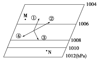 (5)图中M、N两地相比,风力较大的是N地,实际大气中特别是近地面空气运动,在三力共同作用下,风向与等压线成一夹角,斜穿等压线,风力的大小又与水平气压梯度力的大小有直接的关系,单位距离内的气压差越大、水平气压梯度力越大,风越大,因此N地的风力较大。
