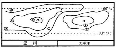 【小题1】根据图示A气压中心的位置,位于亚欧大陆较高纬度,故判断为亚洲高压,而B为阿留申低压。