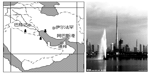 材料二 西亚部分地区城市和石油天然气分布图和迪拜建筑景观图