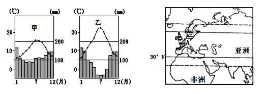(2)甲、乙的气候特征与A地相符的是_____;比较甲、乙两种气候特征的差异___________________________________________。