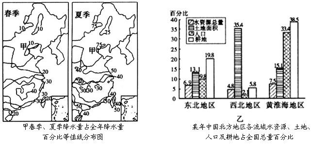 (1)图甲中,春季降水量占全年降水量的百分比最大的地形区是______,分析造成该现象的主要原因。