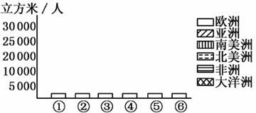 本题解析:本题主要考查学生的图表分析、判断和绘制图表的能力。第(1)题,由表中径流总量和人均径流量判断各大洲的名称,人均径流量最多的大洲是大洋洲,径流总量最多的是亚洲,其次是南美洲,因此表中A为亚洲,B为非洲,C为南美洲,D为大洋洲。第(2)题,结合第(1)题分析及表中数据图例画出即可。第(3)题,属基础知识考查,结合所学知识回答即可。第(4)题,表中资料反映地球上的水资源分布不平衡,这是世界上许多国家“闹水荒”的自然原因。另外,随着经济发展和人口增长,对水资源的需求量增加,需求量增长速度远超过可供水量增长速度,并且人类的生产和生活活动使水体污染加重,可用的水资源减少是导致“水荒”的人为原因。