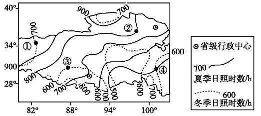 【小题2】根据图示经纬度可知 ,该区域位于青藏高原上,西部全年多晴朗天气,冬夏日照时数的差异主要在于昼夜长短的差异,所以本题C正确。