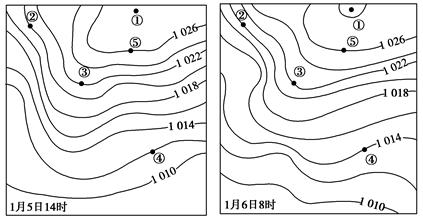 5、单选题 下图示意北半球某区域2014年1月5日14时和6日8时海平面气压(单位:百帕)分布。读图完成下列各题。