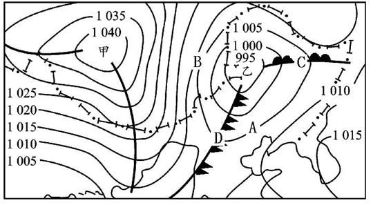 图中A、B两地,风速较大的是____,B处的风向为____;从锋的类型看, C为____,D为____。(4分)