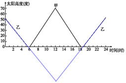 由图可知,甲太阳高度最大时,乙地太阳高度最小,故甲乙两地所在经度之和为180度,且乙地位于南半球,又由图可知,乙地太阳高度最大为50度,即太阳直射北纬20度时,乙地的正午太阳高度为50度,根据太阳高度的计算公式可知乙地对应纬度为南纬20度,因此甲乙两地均位于南北回归线之间,故甲乙两地一年有两次直射机会,当太阳直射南纬10度时,甲、乙两地正午太阳高度相同。