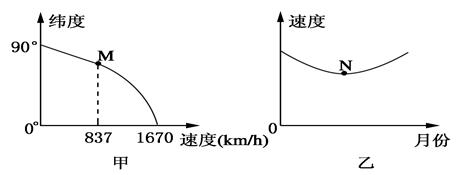 【小题1】地球自转线速度赤道最大,约1670km/h;地球各纬度的线速度=赤道线速度*当地纬度的余弦值 图中的M点的线速度大约是赤道的一半,纬度大约是60°;乙图中地球公转的速度是一年中最小,是在远日点7月初。选C正确。